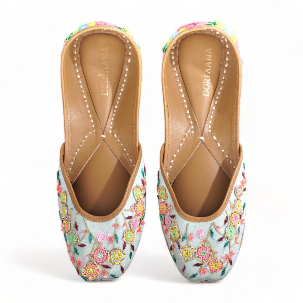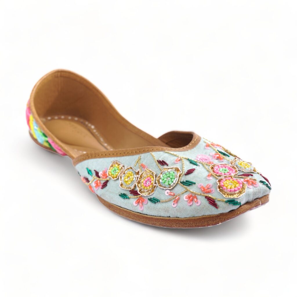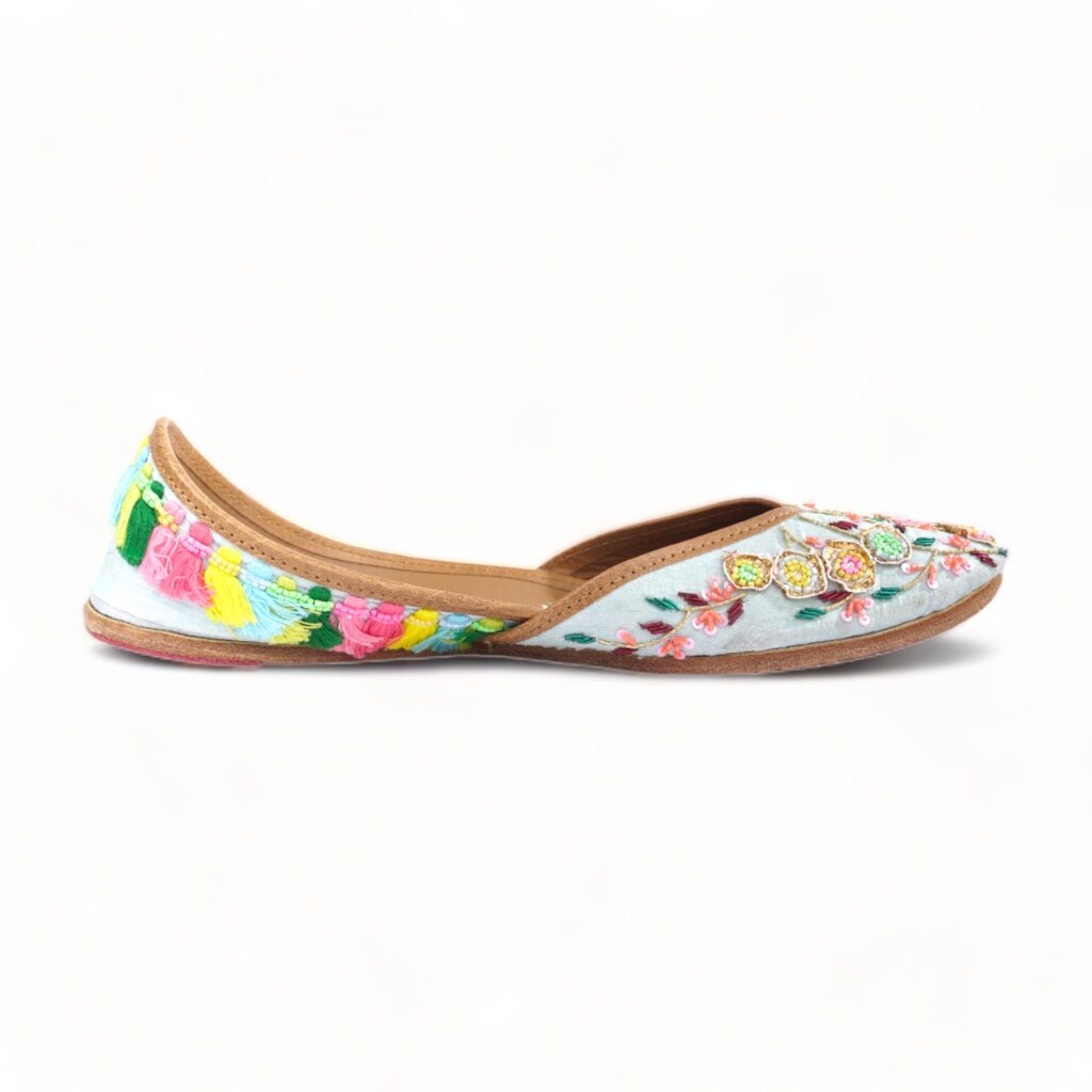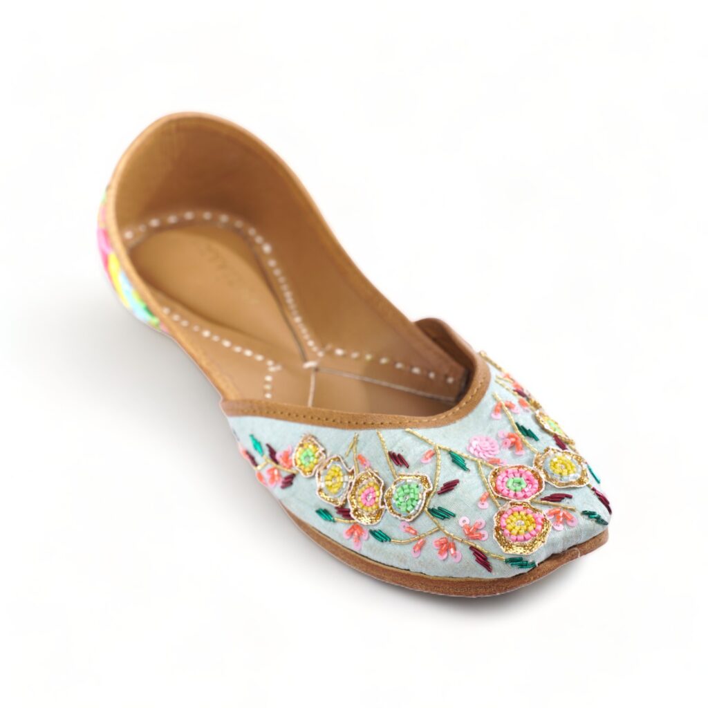 PHULWAARI offers a serene and calming presence in sky blue, adorned with intricate multicolor beadwork and delicate flower embroidery. These shoes are a masterpiece of craftsmanship, adding an elegant and colorful touch to your ensemble.